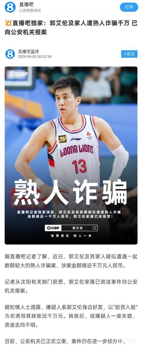 直播吧著作页面(央广网发 直播吧App截图)记者梳剃头现,对于“郭艾伦被愚弄近千万”的音书源于直播吧App。4月5日,“直播吧篮球”账号发布《直播吧独家:郭艾伦及家东谈主遭熟东谈主愚弄千万已向公安机关报案》一文,关联话题很快冲上热搜。7日下昼,记者干系沈阳警方关联责任主谈主员,参议“郭艾伦被愚弄近千万”关联现实是否属实,该责任主谈主员对此未作明确回报,但暗示郭艾伦已针对此事辟谣。记者尝试致电直播吧运营方厦门傲播汇注科技有限公司,电话无东谈主支吾。律例7日14时许,直播吧App“篮坛那些事儿”账号发布触及“郭艾伦被骗细节”关联现实照旧无法查抄。