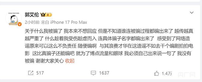 郭艾伦否定被骗(央广网发 郭艾伦微博账号截图)郭艾伦在回报中说:对于什么我被骗了开云体育,我本来不思回报,然而不知谈谁连被骗流程皆编出来了,越传越真越严重了。什么趁着我受伤乘隙而入,连具体骗子名字皆编出来了,感受到了汇注责问底本不错这样不负包袱,璷黫编啊。与其忽地才华在这责问不如去干个编剧拍拍电影,这比真骗子还能编吧,就为了博点流量和眼球,我必须我方出来说一句了,我莫得被骗,谢谢巨匠护理。(标点标志为记者注)